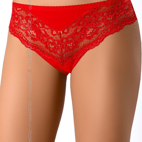 Sexy red Maisa panties V-7593 is a must have for the V-7591 Maisa bra. They are made of delicate lace with triangle tulle inserts. Cut of panties is very sensual and alluring. They perfectly emphasize the roundness of your hips. Delicate back cut with a small bow adds a coquettish touch. Size Hips width L 98-103 cm M 93-98 cm...