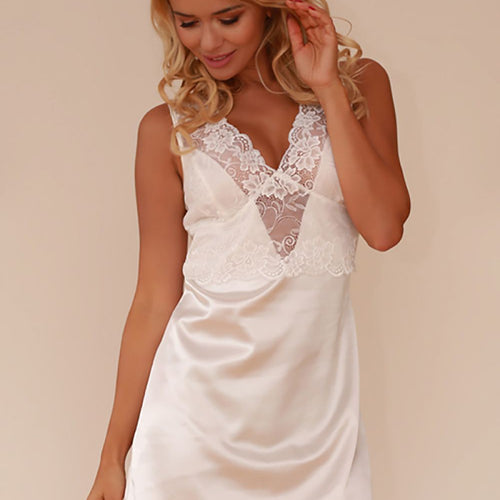 Seductive, yet elegant satin chemise that should be in every woman's wardrobe. Combination of 3/4 length sleeves with wide lace adds lightness and femininity. The robe is coquettishly tied at the waist, finished with semicircular bottom ? Romantic and incredibly sensual at the same time. Your idea for the evening - you choose. You want to emphasize your feminine silhouette...