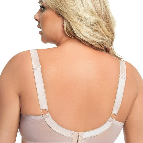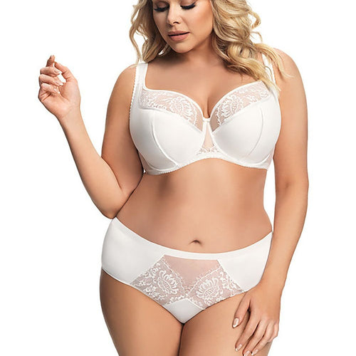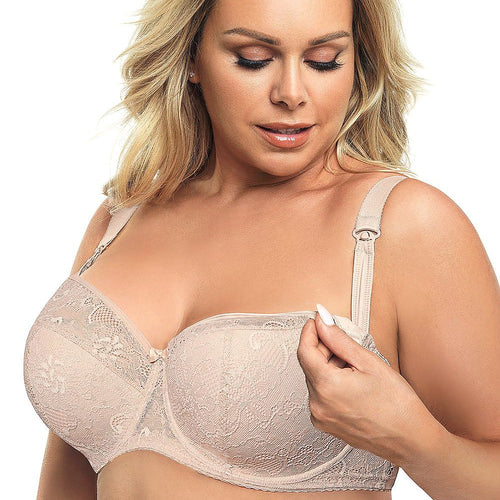Semi-padded underwired bra with quick - click system created for newly-born moms. Made of soft knitwear in beige color, lined with cotton. Cups topped with lace with a lovely floral motif. The bra, thanks to quick-release straps, allows feeding on demand while maintaining a high level of comfort for the nursing woman. Cotton 21 % Spandex 8 % polyamide 71...