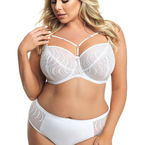Soft bra in a basic white colour. Decorated with stylish embroidery, which perfectly complements the whole. The bra is made of mesh knitted fabric with sensual, light transparency. Upper edge decorated with ribbon. Straps with bows. The center of bra with gold tag. Construction perfectly gathers breasts from sides, lifts them and perfectly presents in neckline, creates beautiful, rounded bust....