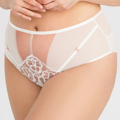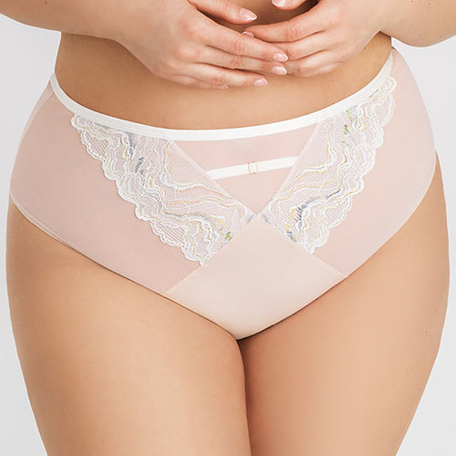 Bikini briefs with a high waist, decorated with delicate lace. Made of soft and breathable fabric, they provide comfort all day long. The back is made of double tulle and covered sides add elegance and subtle charm. There is a delicate, holding elastic band at the waist and a cotton insert inside for additional comfort. Packaged in an elegant box,...