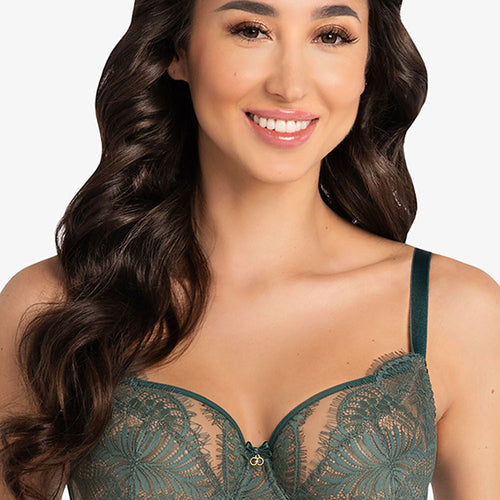 Soft bra designed for women with medium and large breasts. Provides a lifting effect and gathers the bust towards the center. 3-part cups made of stable lace with eyelashes on stable tulle. The upper edge of the cup is finished with smooth tape. A decorative element in rose gold color on the basque. The back made of transparent lycra ensures...