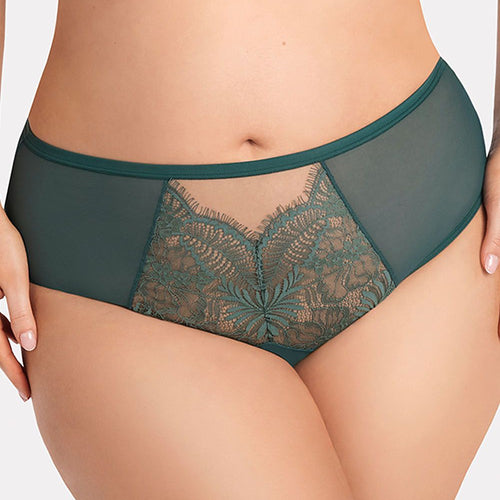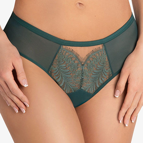 "Classic cut figs with a high waist combine elegance with comfort. Adorned with delicate lace and mesh inserts, they look exceptionally stylish. The soft and breathable fabric ensures comfortable wear, while the double tulle at the back adds subtle sensuality. The front of the figs is decorative, emphasizing their refined character. Inside there is a cotton insert providing additional comfort....