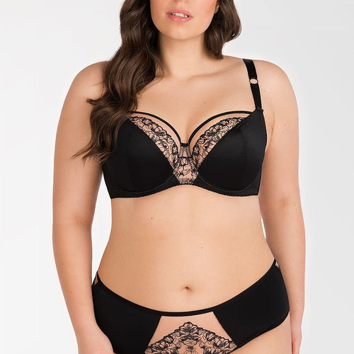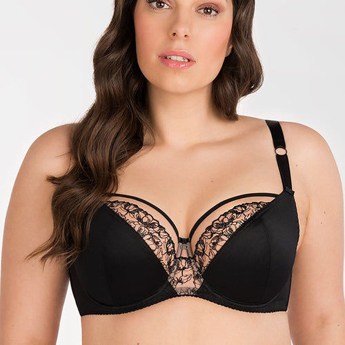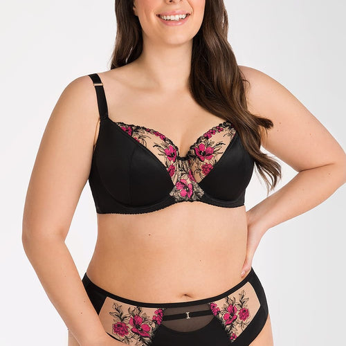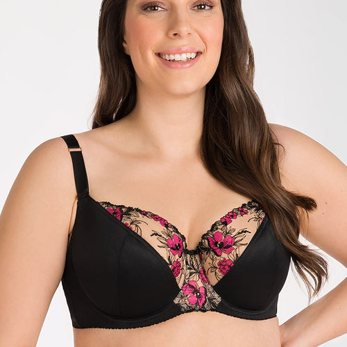 Elegant soft bra in black color. - ideal for women with medium, large and extra large breasts. - the upper part of the cup and the middle are covered with pink-black embroidery on beige mesh. - the lower part of the cup is made of stable knit fabric - shoulder straps offset to the side, bust gathered firmly inward -...