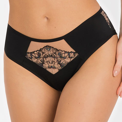Elegant high-waisted panties in black color. They cover almost the entire buttocks, and are entirely made of lace and mesh. The front is decorated with stripes, the legs are finished with double folded mesh. Spandex 7 % polyamide 90 % Polyester 3 % Size Hips width L 98-102 cm M 94-98 cm XL 102-106 cm XXL 106-110 cm XXXL 110-114...