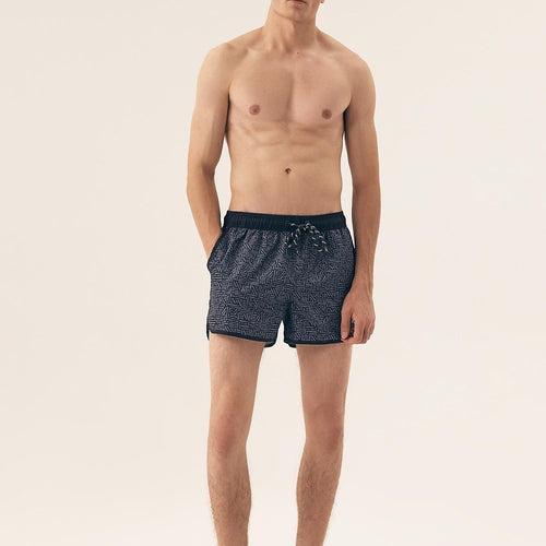 Stylish men's swim shorts made of lightweight material with an eye-catching print that beautifully enhances the tan. The model has side pockets and practical slits on the sides, providing greater freedom of movement. Inside, there is a comfortable lining, and drawstrings at the waist for a perfect fit. The fabric is quick-drying, making the swim shorts perfect for both the...