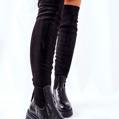 Beautiful women's boots with an upper over the knee. The model was made of pleasant to the touch eco-suede. Fastened with a zipper on the side of the upper. In addition, the boots have a binding, thanks to which they can be properly adjusted. The model is set on a massive flat heel and platform. The boots have warming in...