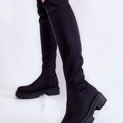 Over-the-knee boots made of stretch fabric. The interior is insulated with a shoe blanket. fabric artificial leather warmers shoe cover Footbed shoe cover Upper height 36 cm Heel height 5 cm Size Insole lenght 36 23 cm 37 24 cm 38 24.5 cm 39 25 cm 40 25.5 cm 41 26 cm