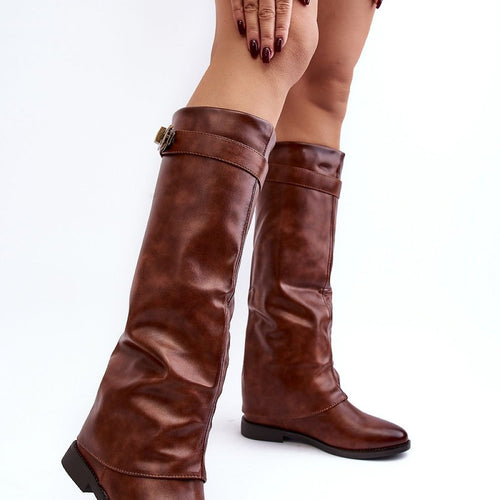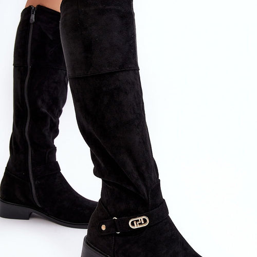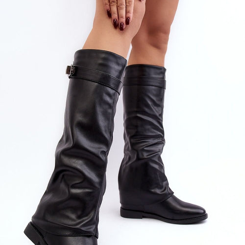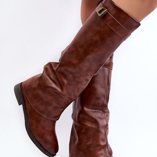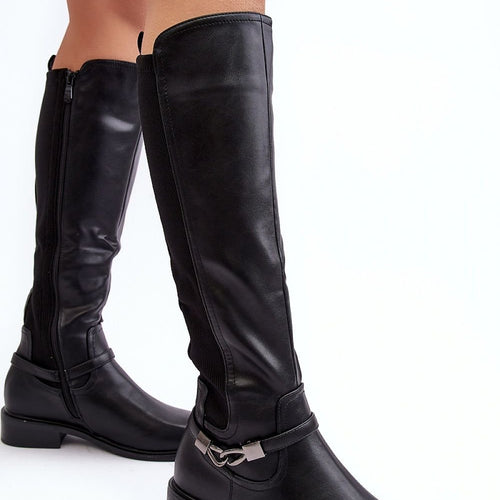 Women's boots made of eco leather. Set on a flat heel. Upper before the knee enriched with a crease and a strap. Rounded toes. The interior of the shoes is insulated with shoe blanket, providing warmth on colder days. In addition, this model has a stiffened heel counter. You should definitely have them! fabric artificial leather warmers shoe cover Footbed...