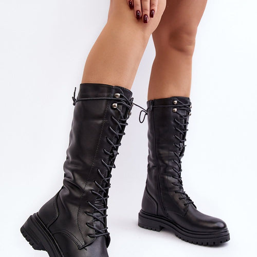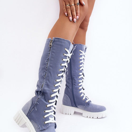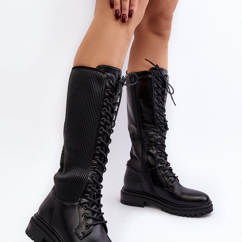 Women's boots with an upper before the knee. Made of textile material. Set on a flat, stable heel. Lace-up model and additionally has two zippers. Rounded toe. Stiffened heel counter. The center insulated with shoe blanket. Fashionable cut that you should have! fabric ~skóra ekologiczna plus tkanina warmers shoe cover Footbed fabric Upper height 38 cm Heel height 5 cm...