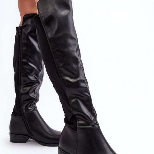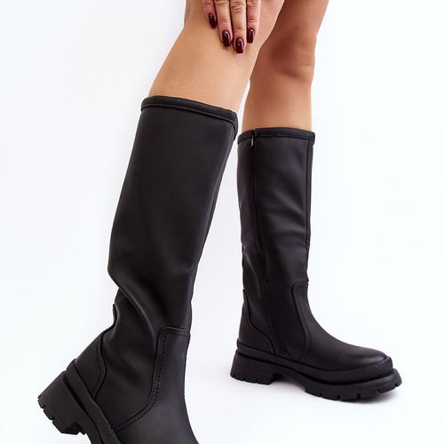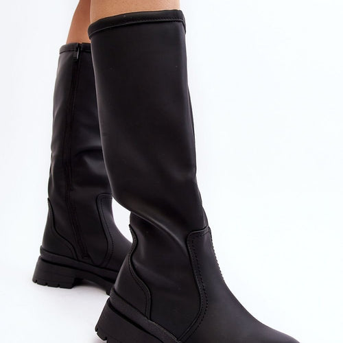 Women's boots made of eco leather. Upper before the knee. Rounded noses. Interior insulated with shoe blanket. Fastened with a zipper. Flat heel will ensure stability on every step. In addition, the boots have a stiffened heel counter. You will certainly use them for many stylings. fabric artificial leather warmers shoe cover Footbed shoe cover Upper height 40 cm Heel...