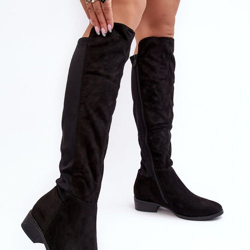 Women's boots made of a combination of eco-suede and textile material. Set on a flat heel. Rounded toe caps. The inside is partially insulated with shoe blanket. In addition, the boots have a stiffened heel counter. The upper is before the knee. You will certainly use them for many stylings. fabric imitation leather suede warmers shoe cover Footbed shoe cover...