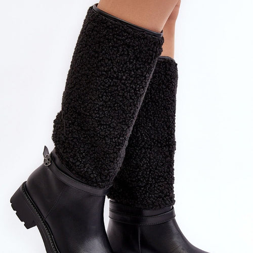 Women's boots on a flat, stable heel. Upper before the knee enriched with lambskin fur and strap. Rounded noses. The heel counter is stiffened. The interior of the shoes is insulated with a shoe blanket, providing warmth on colder days. You should definitely have them! fabric artificial leather warmers shoe cover Footbed shoe cover Upper height 36 cm Heel height...