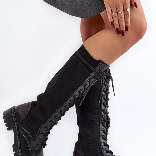 Women's boots made of a combination of eco leather and textile material. Set on a flat heel. Rounded toe caps. Upper before the knee in the form of a sock. This model will be perfect for many autumn stylings! You absolutely must have them! fabric ~skóra ekologiczna plus tkanina Footbed shoe cover Upper height 36.5 cm Heel height 4.5 cm...