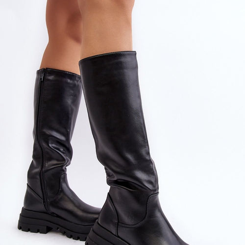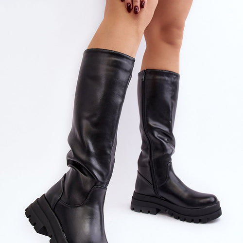 Classic women's boots made of eco leather. Upper before the knee. Model with zipper closure along the entire length of the upper. The boots are set on a platform and a flat heel. The inside is insulated with shoe blanket. In addition, the heel counter in these boots is stiffened. You should definitely have them! fabric artificial leather warmers shoe...