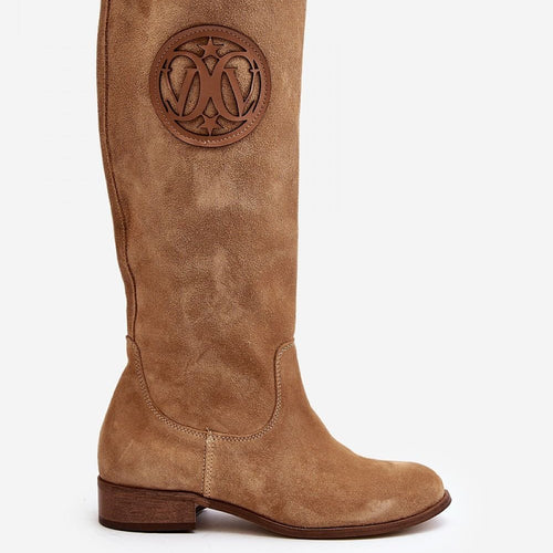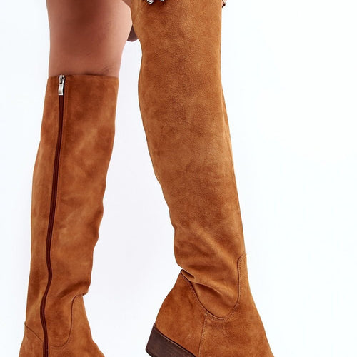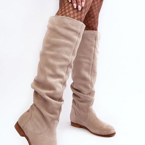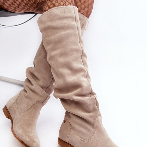 Women's boots are made of high-quality natural suede. Set on a flat heel. Over-the-knee upper with a cutout at the top. Almond-shaped toes. The natural leather insole will ensure comfort during the use of the shoes. This fashionable cut will go well with many styles! fabric ~skóra naturalna zamszowa Footbed natural leather Upper height 50 cm Heel height 3.5 cm...