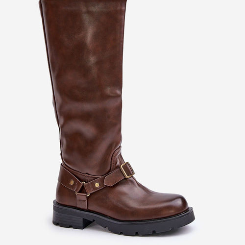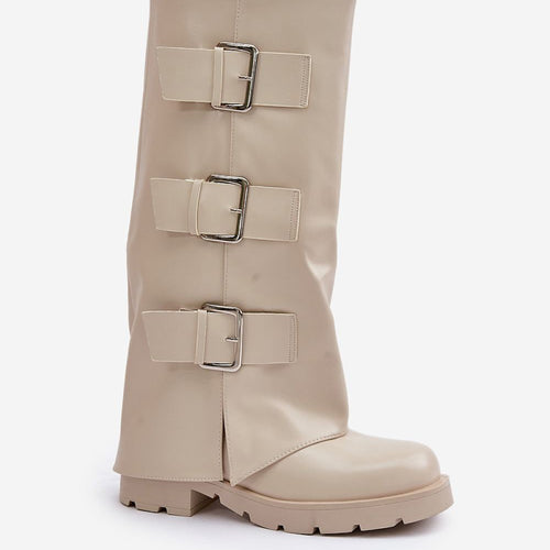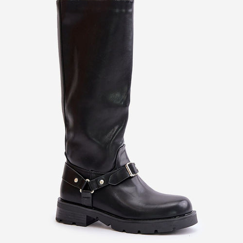Women's classic cut boots made of eco leather. Mounted on a flat heel, which provides comfort for everyday wear. Rounded toes and a shaft that reaches the knee, adding elegance and elongating the silhouette. Fastened with a zipper, making it easy to put on. An additional advantage are decorative straps with gold buckles, which give them a unique character. fabric...