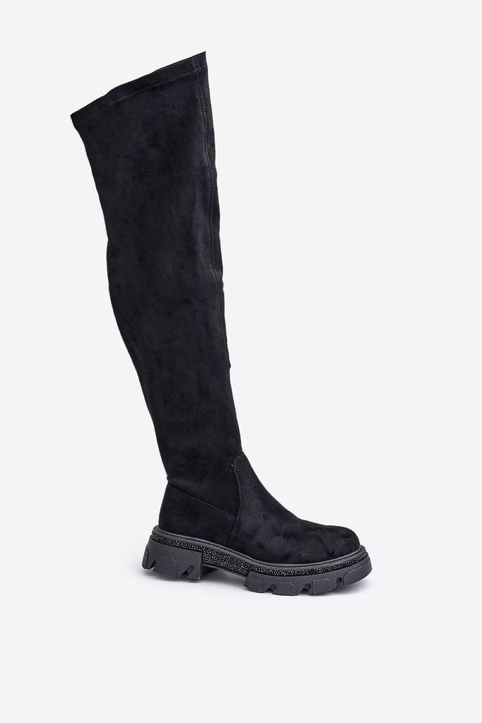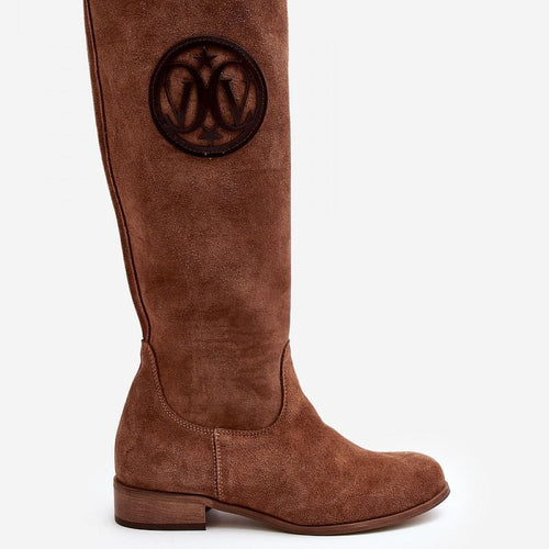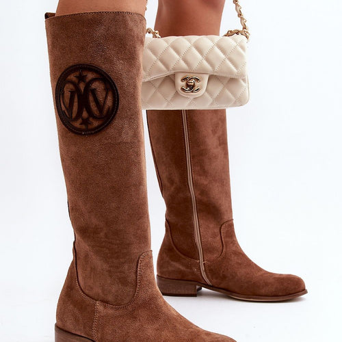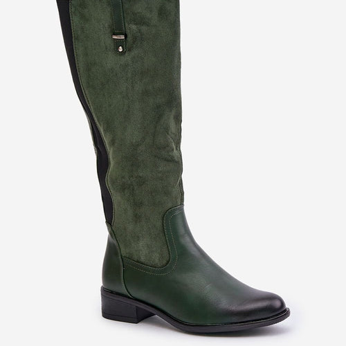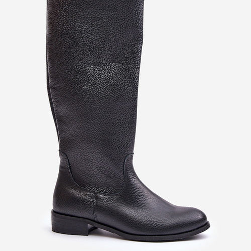 Women's boots made of high quality natural leather. Fastened with a zipper on the side. Upper before the knee. Set on a flat, stable heel. They do not have any warming. Rounded toe caps. The heel counter is stiffened. This classic cut will go well with many stylings! fabric ~skóra naturalna zamszowa Footbed natural leather Upper height 39 cm Heel...