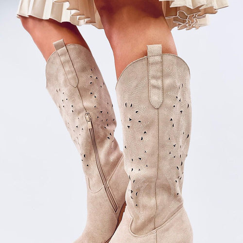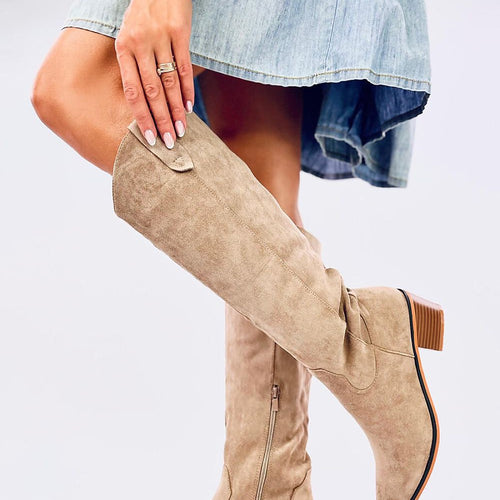 Women's knee-high boots made of eco-suede. Mounted on a low heel. Slip-on model with an additional zip fastening. Rounded toes. Insulated with a shoe blanket only at the foot's height. They will work great with short skirts or dresses. These boots must be yours! fabric imitation leather suede warmers fabric Footbed shoe cover Upper height 54 cm Heel height 5...