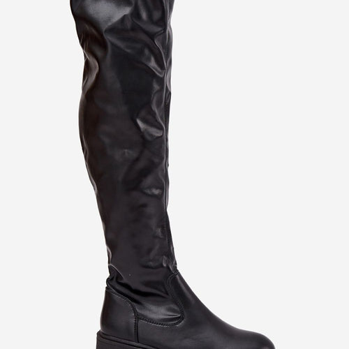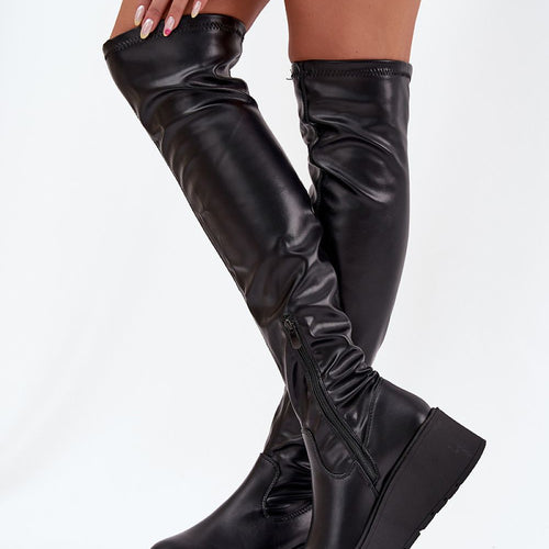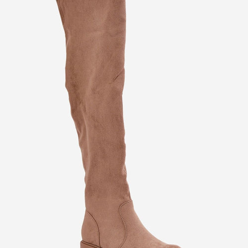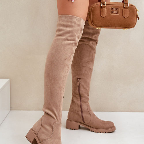 Women's boots with an upper reaching beyond the knee. Made of ecological suede. Set on a low heel. Slip-on model with additional zipper closure. The noses are rounded. Interior partially insulated with shoe blanket. They perfectly match with short skirts or dresses. These boots should definitely be in your winter footwear collection! fabric imitation leather suede warmers shoe cover Footbed...