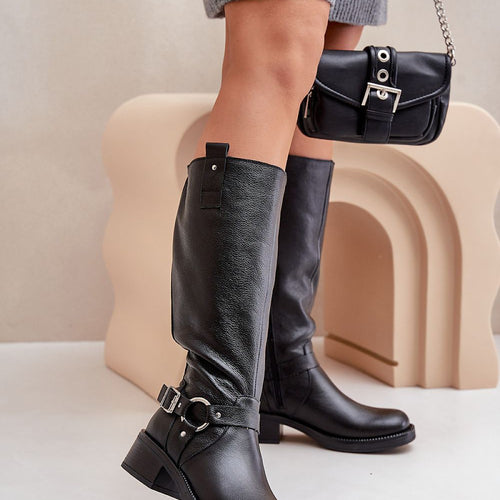 Women's boots made of natural leather. The upper, reaching before the knee, adds elegance and perfectly harmonizes with a variety of styling. A subtle look is provided by the rounded nose. The model is zippered, which makes it easy to put on, and decorative stripes on the upper give them character. The center is insulated with felt. Ideal for everyday...