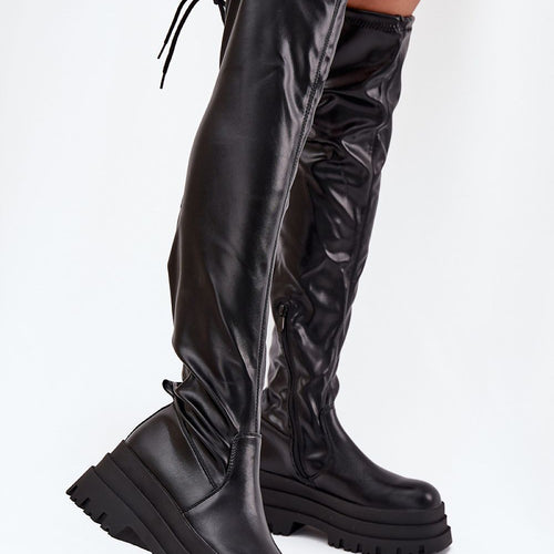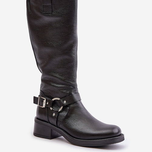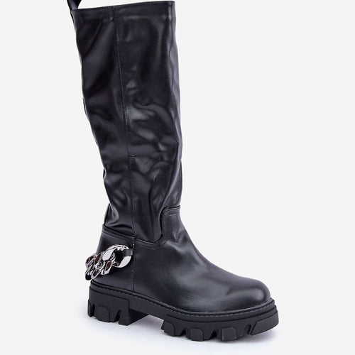 Women's boots made of eco leather are the perfect combination of comfort and style. The flat heel ensures comfort throughout the day. Rounded toes. The shaft reaching above the knee is decorated with a trendy chain. Stylish and versatile, they will work great in everyday and more elegant stylizations. fabric artificial leather warmers fabric Footbed fabric Upper height 38 cm...