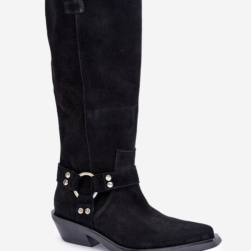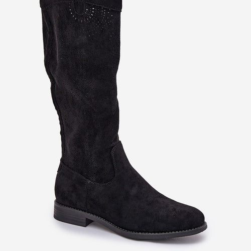 Women's knee-high boots made of faux suede are a stylish choice for the autumn-winter season. The model set on a flat heel ensures comfort and convenience while wearing. The over-the-knee shaft adds elegance and complements fashionable stylizations perfectly. The shoes have rounded toes and are lined at the height of the foot, guaranteeing warmth where it is most needed. Perfect...