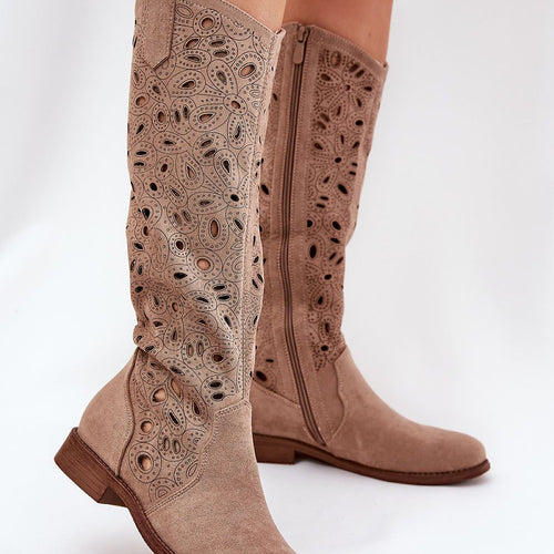 Women's boots from the S.Barski brand. Made of eco suede. Set on a flat heel, they provide comfort throughout the day. The openwork pattern on the upper adds lightness and a modern character to them, and the zip fastening makes them easy to put on. These boots are a perfect choice for everyday, spring stylizations, combining functionality with a fashionable...