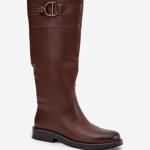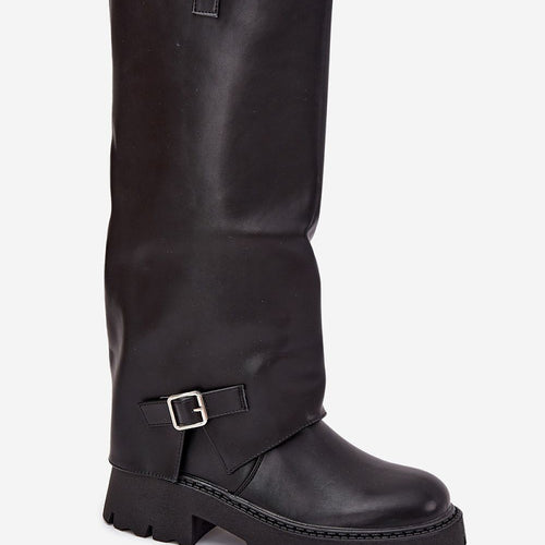 Fashionable, women's knee-high boots made of eco leather are a must-have for colder days. Set on a platform and a flat heel, they provide stability and comfort with every step. The turned-down shaft decorated with a strap with a buckle is the main advantage of this model, adding character to it. The toes are rounded, and the interior is lined...