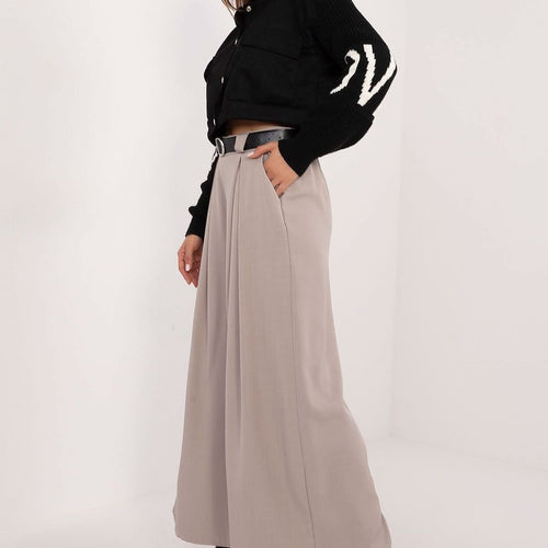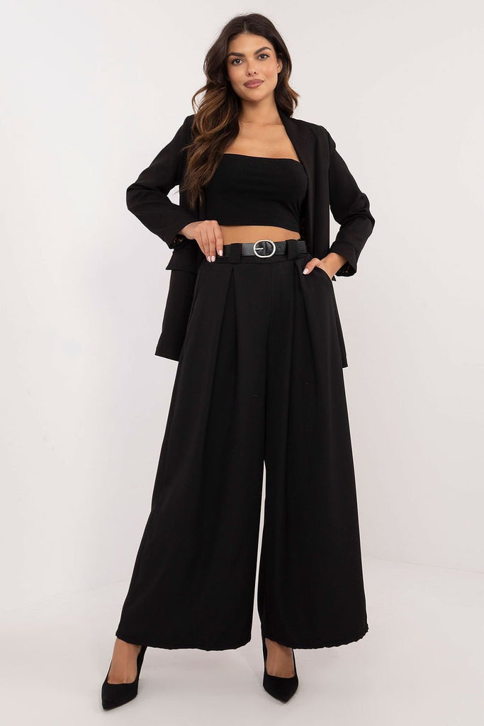 Women's wide leg fabric pants, ideal for work and formal occasions. Made from a combination of polyester and elastane, they offer comfortable wear and an elegant look. The high waist with a buckled waistband and elastic back waistband provide a perfect fit and comfort. The wide legs add lightness and freedom of movement, while the plain pattern makes the pants...