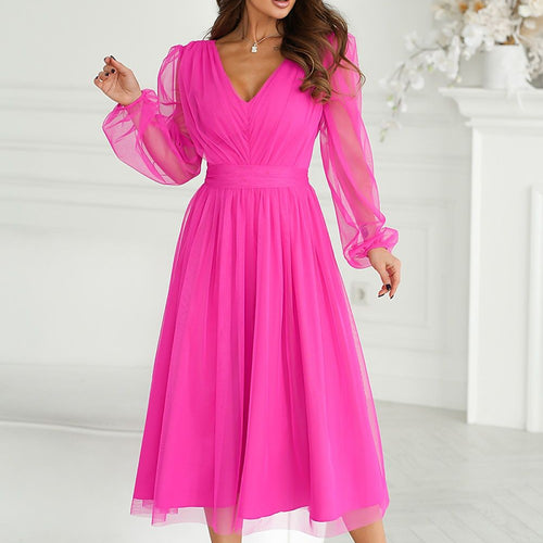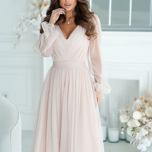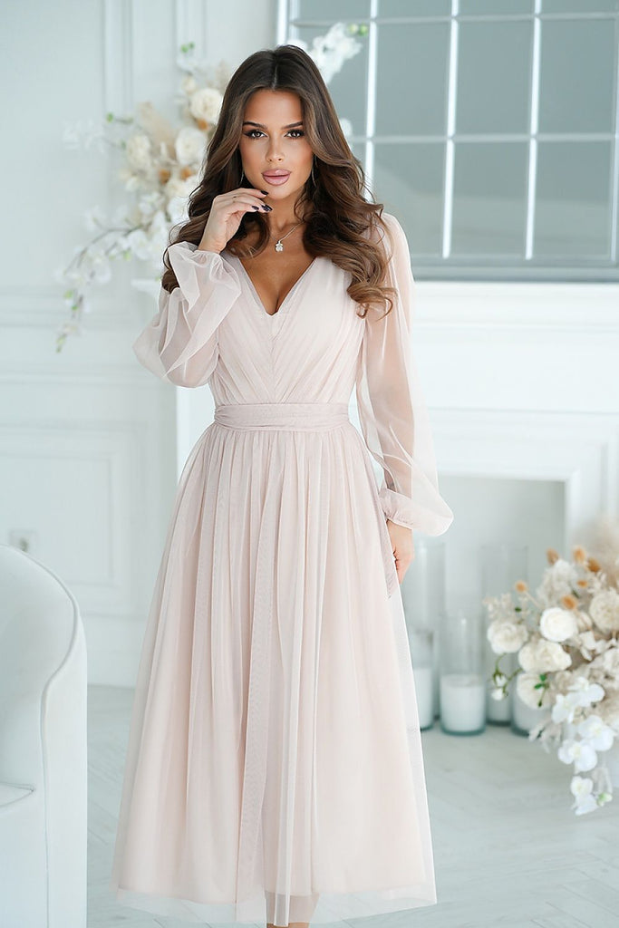 Midi dress with a slightly flared layered skirt trimmed with brocade mesh. The top of the creation is crinkled with long sleeves finished with elastic. The sleeves are sewn from the same mesh as the rest of the dress. Cheese-shaped neckline and back. Model adding chic and femininity. The dress is fastened with a covered zipper and has a lining....