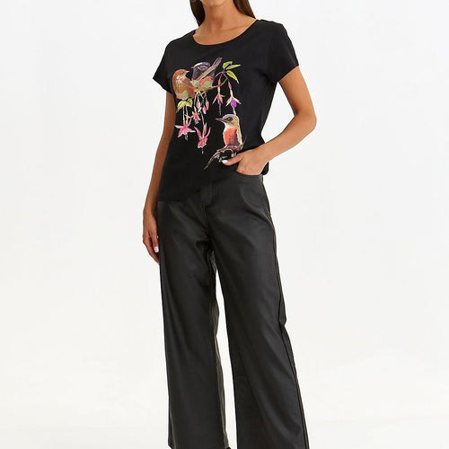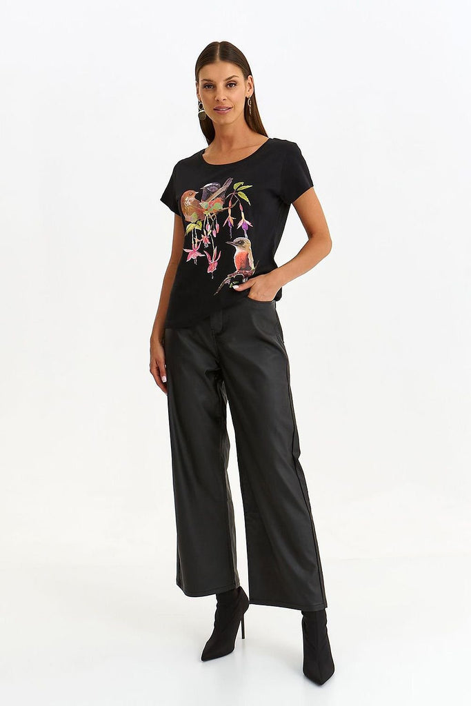 Full of convenience and comfort during use, this women's T-shirt has a loose fit with short sleeves finished with delicate stitching. It has a round neckline with delicate piping around it, being enriched all over the front with a colorful print with an image of birds and flowers. It is made of pleasant to the touch and good quality cotton...