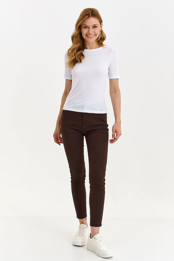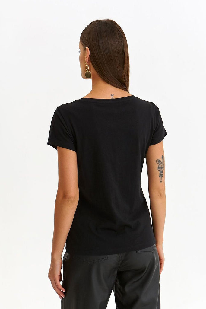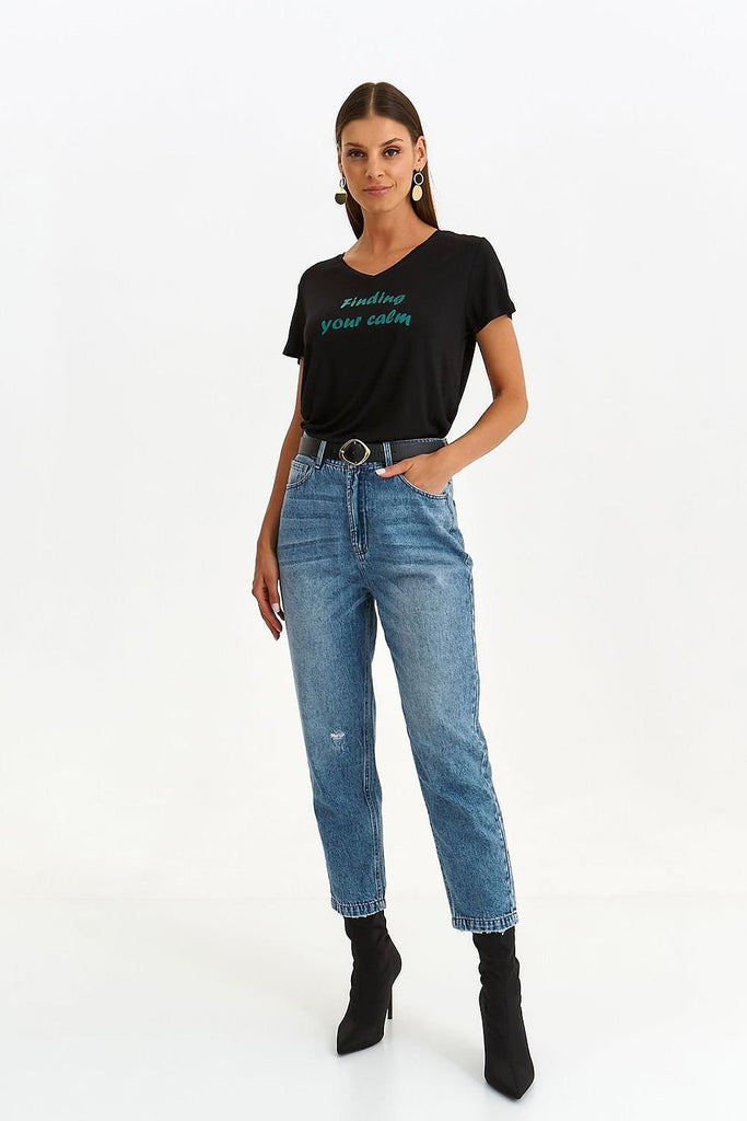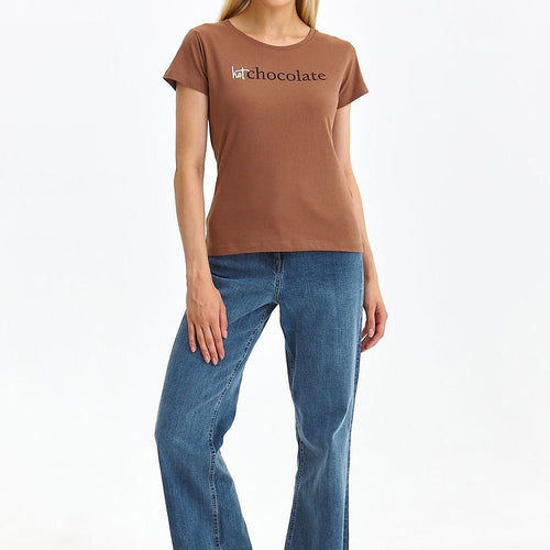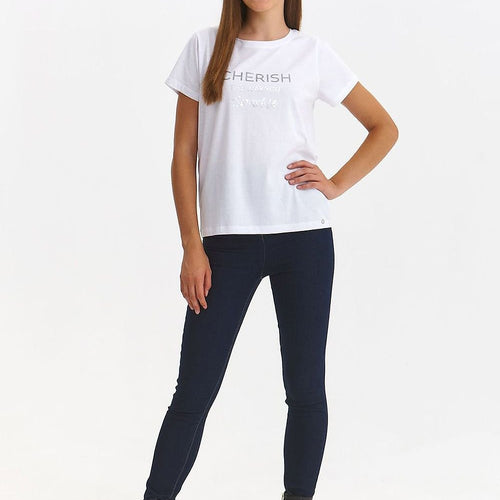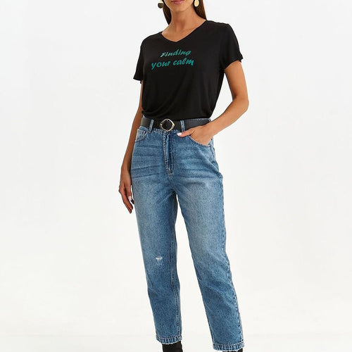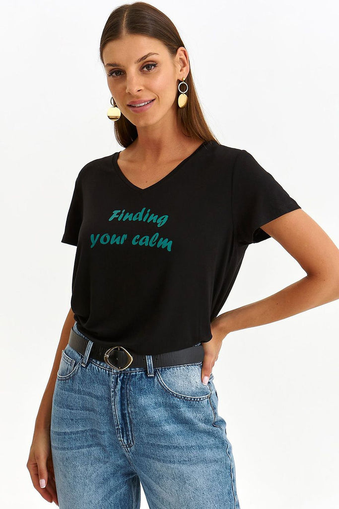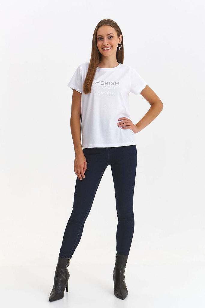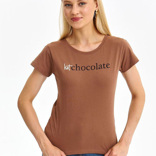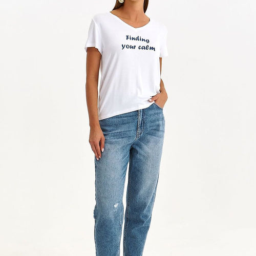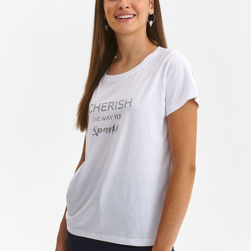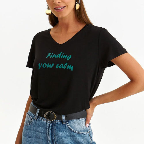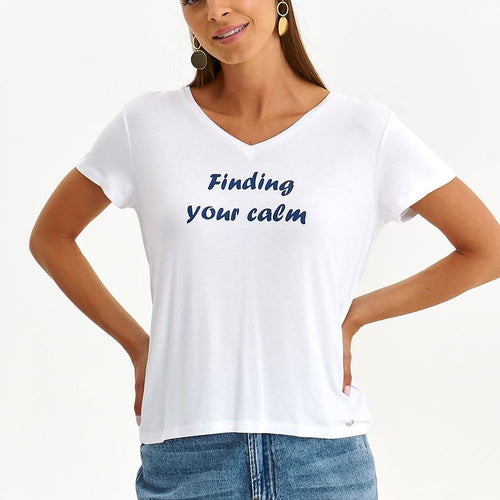 Comfortable and wearable women's T-shirt with a simple loose fit with short sleeves finished with delicate stitching. It has a round neckline with delicate piping around it and has been enriched with an intriguing inscription on the front at bust level. It was made of pleasant to the touch and good quality cotton fabric, being appreciated for the offered softness...