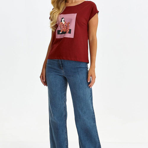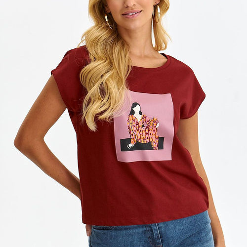 Captivating with its full simplicity, this women's T-shirt has short kimono sleeves finished with delicate stitching. It features a striking slightly oval neckline with delicate piping around it, and its front is decorated with an intriguing print with a novel feminine motif. It was made of pleasant to the touch and durable cotton fabric, being a must-have for any woman's...