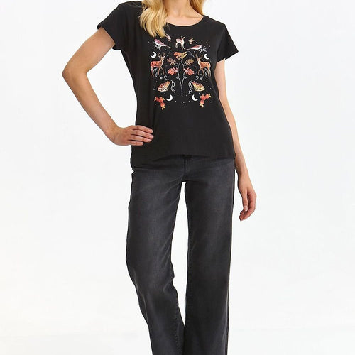 This women's T-shirt has a simple loose fit with short kimono sleeves finished with delicate stitching. It has a magnificent round neckline with delicate piping around it and is enriched with an interesting application on the front with an image of animals and plants. It was made of pleasant to the touch and good quality cotton fabric, being especially recommended...