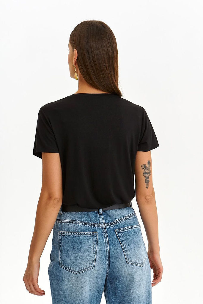 Women's T-shirt of a very loose cut with short kimono sleeves finished with delicate stitching. It has a striking v-neck with delicate piping around it, and its front at bust level is enriched with an interesting print. It is made of pleasant to the touch and delicate viscose knitwear, proving perfect for a variety of feminine outfits, both with classic...