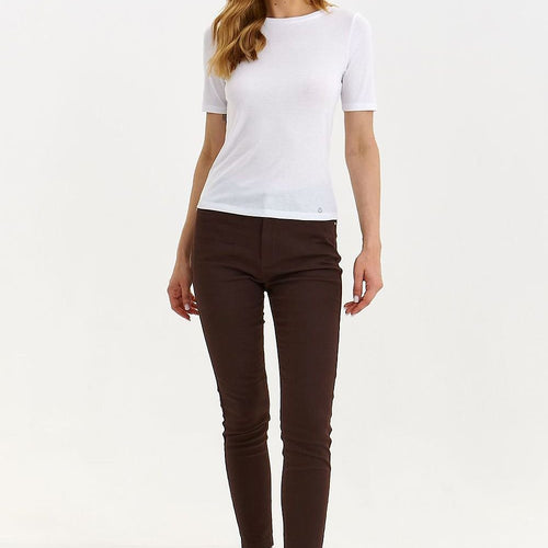 Comfortable to wear and classic in its style and cut, the fitted women's T-shirt, which adheres to the female figure and exposes its assets. It has short sleeves with delicate topstitching at the end and a magnificent oval neckline with a trim around it, and is made of pleasant to the touch and delicate knitwear, being appreciated for the softness...