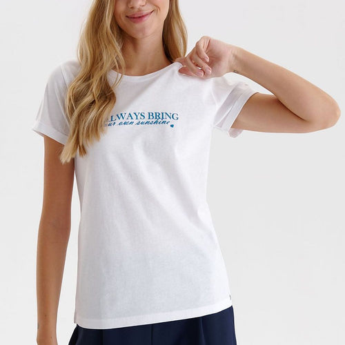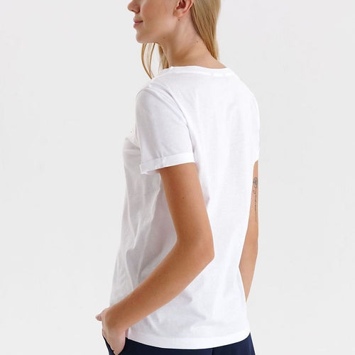 Definitely classic in its style and cut, this women's T-shirt has a loose fit with very short sleeves ending in a delicate turn-up and an impressive slightly oval neckline. The charm is added by an eye-catching printed inscription on the front at the bust level, as well as by being made of good quality and pleasant-to-touch cotton fabric. It will...