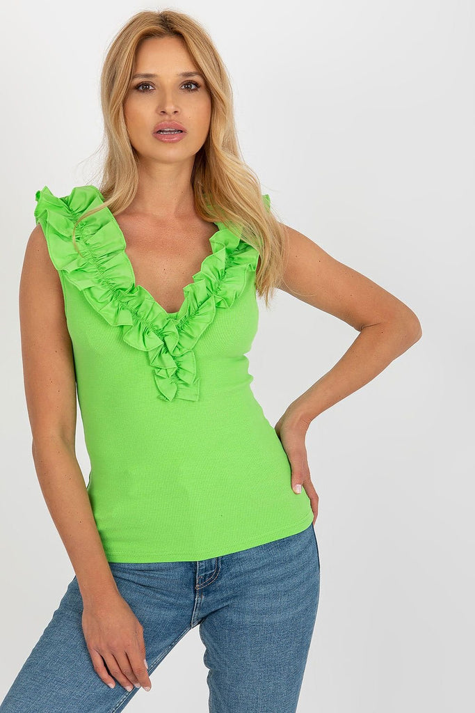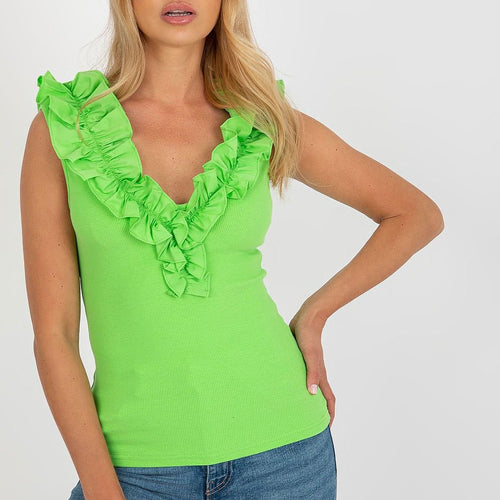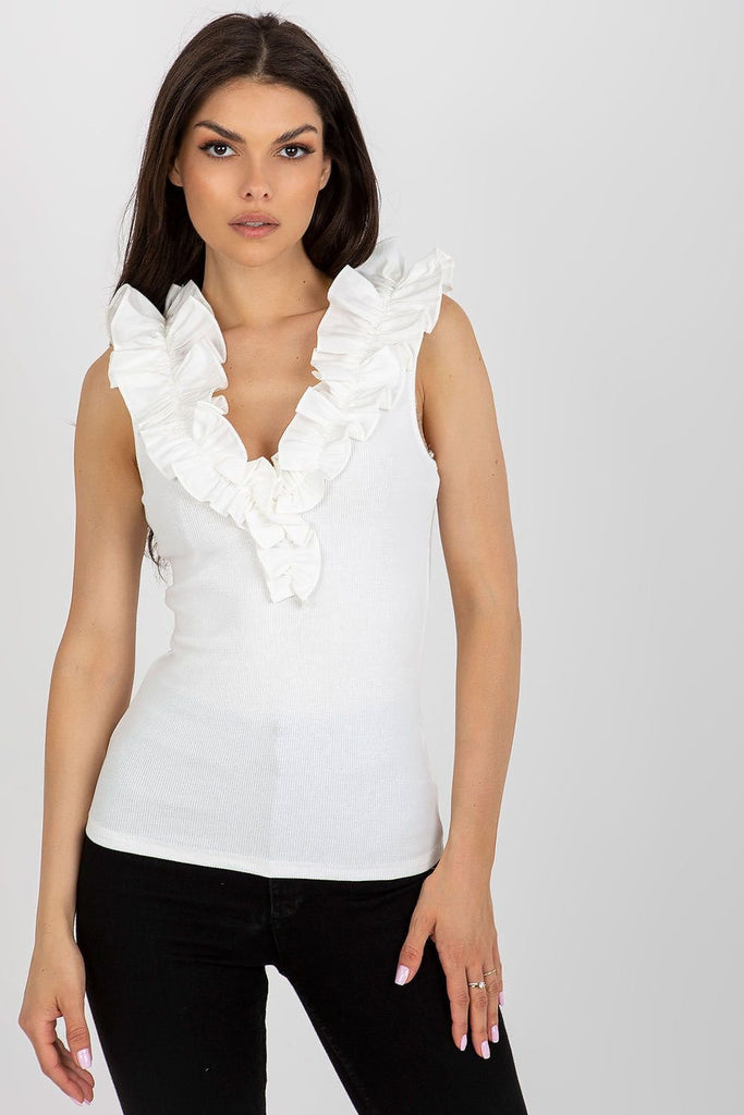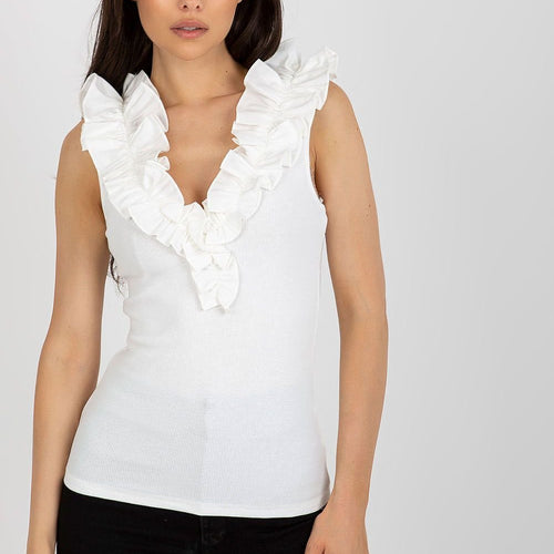 Shirt made of ribbed fabric without sleeves. Neckline trimmed with a decorative frill. Cotton 95 % Spandex 5 % Size Total length Chest one-size-fits-all 58 cm 80 cm