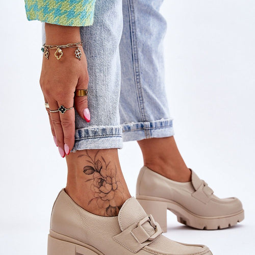 Wonderful mid-heeled shoes with an upper made of natural leather. The interior is covered with natural leather and textile material, so they are very comfortable to wear. The insole is made of natural leather, and the sole is made of rubber material. A stylish heel in the form of a wide post will provide stability at every step. Mirror decoration...