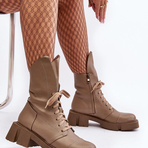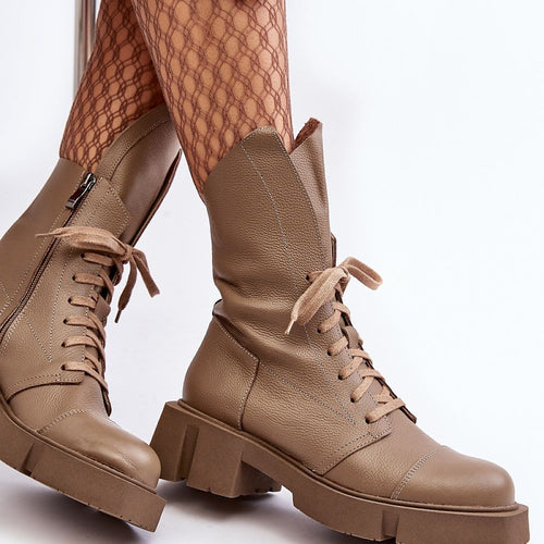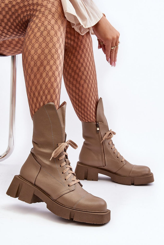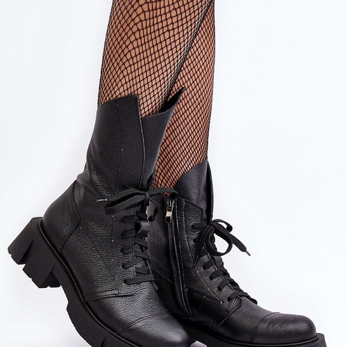 Women's boots made of natural leather. Set on a massive flat heel and a platform. Fastened with a zipper. Lacing at the front. The heel counter is stiffened. Soft insole will provide comfort during use. Rounded nose pads. This fashionable model will fit into many autumn-winter outfits! fabric natural leather Footbed natural leather Upper height 20 cm Heel height 5...