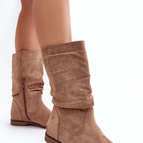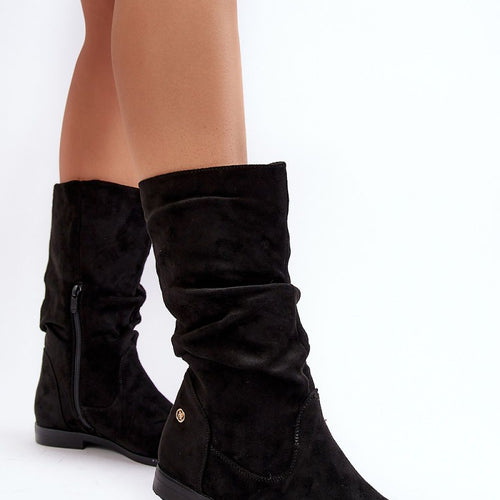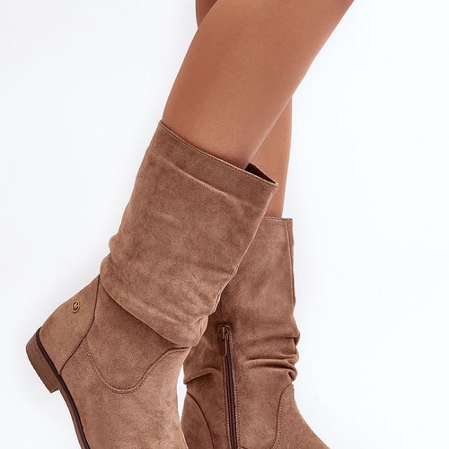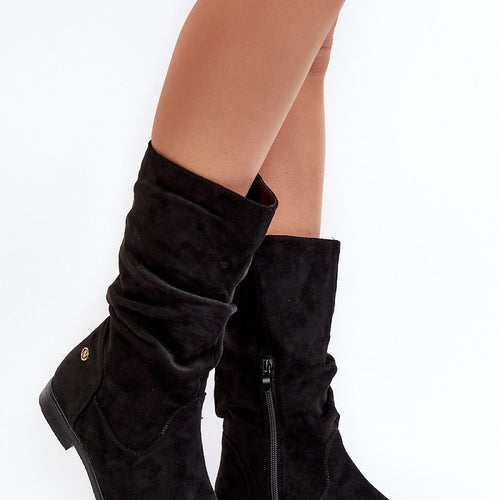 Women's boots with a higher, creased upper. Set on a flat heel. Made of eco-suede. Slip-on model. The inside is insulated with a nice-to-touch shoe blanket. Rounded toes. You can match this classic model with pants, skirts or dresses. You should definitely have them! fabric imitation leather suede warmers shoe cover Footbed shoe cover Upper height 27 cm Heel height...