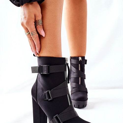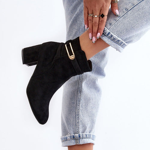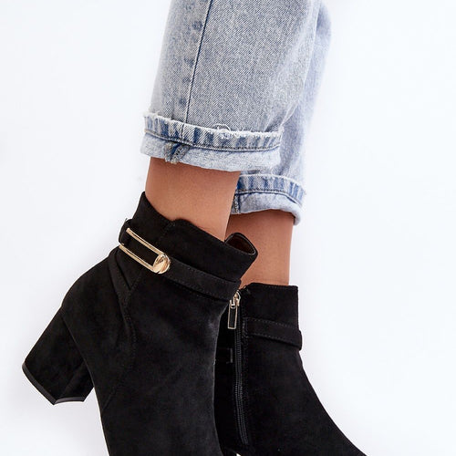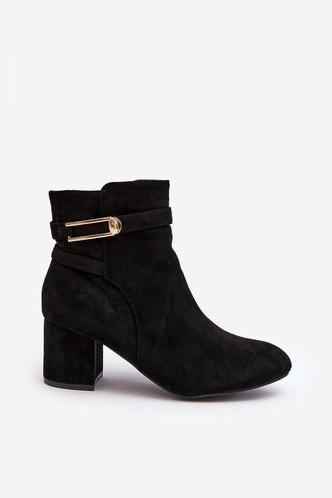 Women's boots with ankle-length upper. Set on a heel in the form of a low post. Made of eco-suede. Fastened with a zipper. Rounded toes. The inside is insulated with shoe blanket. On the top of the upper two thin straps. In addition, this model has a stiffened heel counter. fabric imitation leather suede warmers shoe cover Footbed shoe cover...