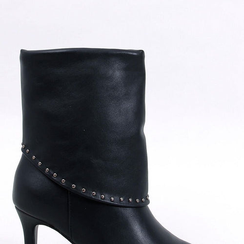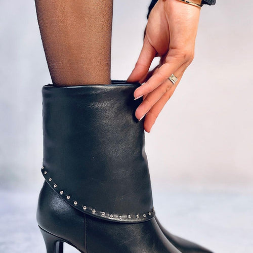 Faceted women's boots on a stiletto heel with a height of 8,5 cm. The shoes are distinguished by a neat cut with a delicate pointed toe and a turned-up upper embellished with studs. The model has a practical zipper closure on the side of the upper, which makes it easy to put on. They are made of organic leather, and...
