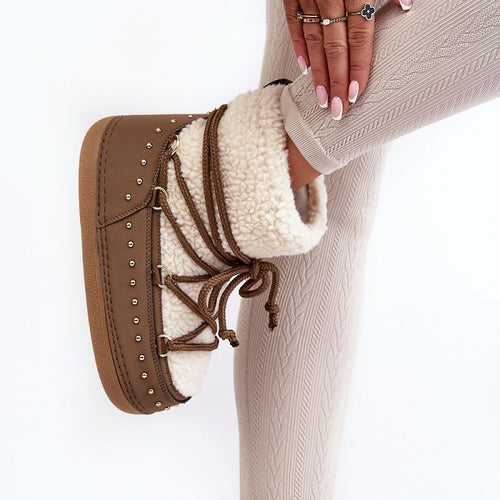 The unique women's snow boots are made of cold and wind resistant material. The upper with artificial sheepskin and studs will be perfect for the autumn-winter season. The model is classically slip-on with additional lacing. The snow boots are set on a massive platform. They have insulating foam and shoe blanket inside, which provide high protection on cold days. fabric...