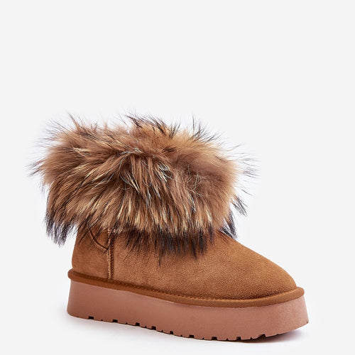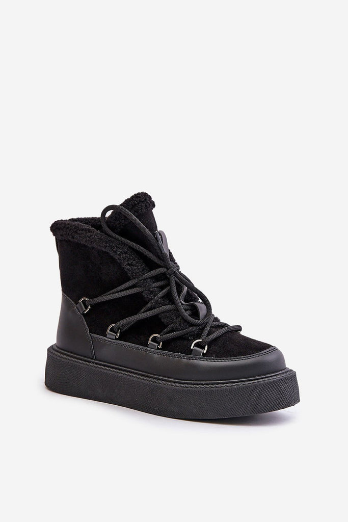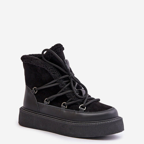 Women's eco-suede snow boots are a combination of style and functionality. Set on a platform, they provide comfort and additional insulation from the cold. The interior is insulated with soft fur, which guarantees warmth on cold days. Fashionable binding on the front adds to their unique character, making them an ideal choice for winter walks and everyday styling. fabric imitation...