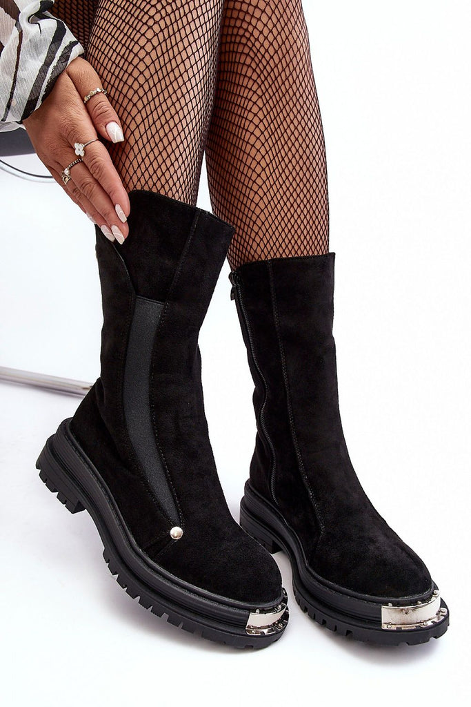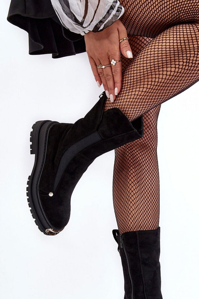 Women's boots made of eco-suede. Set on a flat, stable heel and platform. Interior insulated with shoe blanket. Zipper closure. Elastic insert on the upper. fabric imitation leather suede warmers shoe cover Footbed shoe cover Upper height 23 cm Heel height 5.5 cm Platform height 3.5 cm Size Insole lenght 36 23.5 cm 37 24 cm 38 24.5 cm 39...