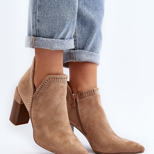 Women's boots made of eco-suede. Set on a heel in the form of a post. Pointed nose will optically slenderize the legs. Upper decorated with an openwork pattern. Zippered on the side. You will surely use them for many spring outfits! fabric imitation leather suede Footbed artificial leather Upper height 9 cm Heel height 9 cm Size Insole lenght 35...