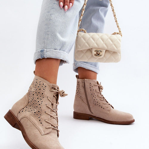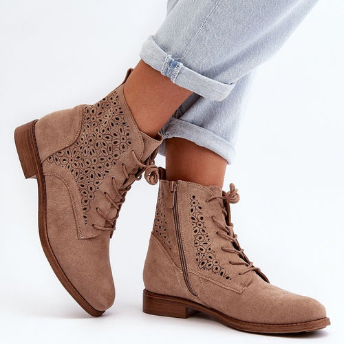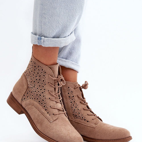 Women's boots made of eco-suede. Openwork upper decorated with flowers. Set on a flat heel. Zippered at the side and additionally have lacing for a better fit. Rounded nose pads. In addition, this model has a stiffened heel counter. Be sure to also check out the other models of boots available in our offer! fabric imitation leather suede Footbed artificial...