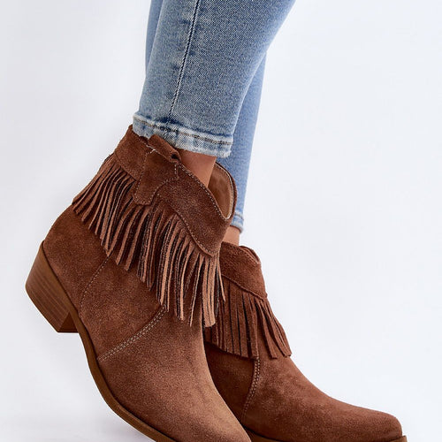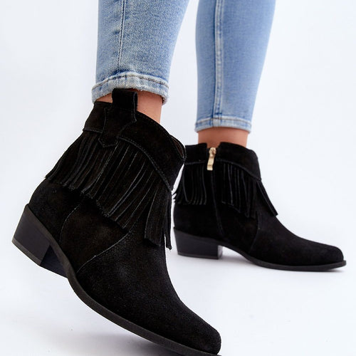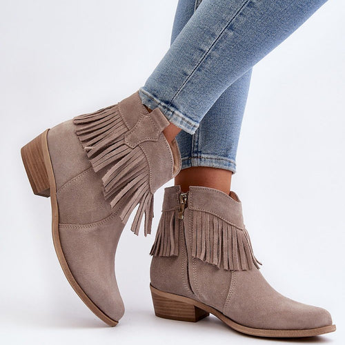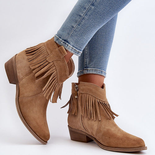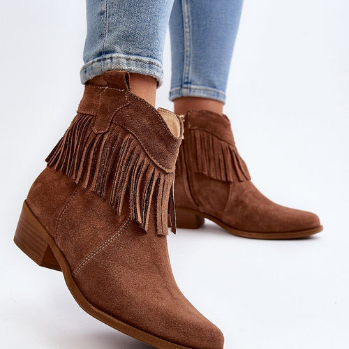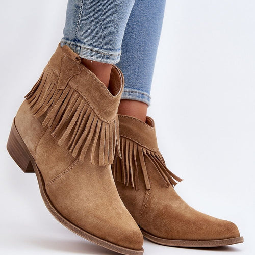 Women's boots made of natural leather. Fastened with a zipper. The upper is decorated with tassels. Pointed nose will optically slenderize the legs. This model will be a perfect complement to spring styling. Ideal for skirts, dresses, as well as pants. This cut is sure to attract attention with its unique style. You should definitely have them! fabric ~skóra naturalna...